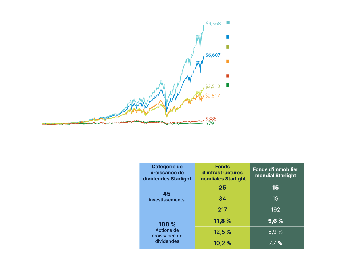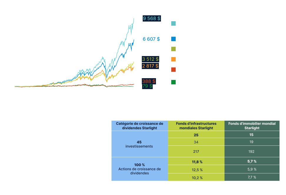 Le Fonds d’immobilier mondial Starlight et le Fonds d'infrastructures mondiales Starlight sont conçus pour offrir aux investisseurs des distributions fiscalement avantageuses soutenues par une forte croissance des dividendes et des distributions des investissements sous-jacents